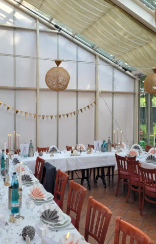 Wintergarten, der das ideale Ambiente für entspanntes Essen bietet. Im Sommer genießen Sie die herrliche